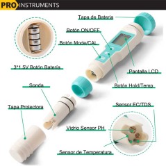 El Pro Instruments COM‑600 es la herramienta multifunción definitiva para analizar la calidad del agua: mide pH, TDS, EC, salinidad, gravedad específica (SG), ORP y temperatura en un único dispositivo. Ideal para uso doméstico, acuarios, piscinas o control de agua potable. Pantalla LCD retroiluminada facilita la lectura y su clasificación impermeable IP67 lo hace ideal para ambientes exigentes. Calibración automática EC en 3 puntos, ATC y apagado automático tras 5 minutos de inactividad.