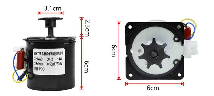 El Motor de Volteo 60KTZY automatiza el giro de los huevos para lograr un desarrollo embrionario parejo y mayor tasa de eclosion. Su motor sincrono reversible (2.5 r/min, 14 W, 220 V 50 Hz) ofrece movimiento suave y silencioso, ideal para incubadoras domésticas y comerciales. Instalacion rapida con orificios de fijacion en las esquinas y diseño robusto para trabajo continuo.